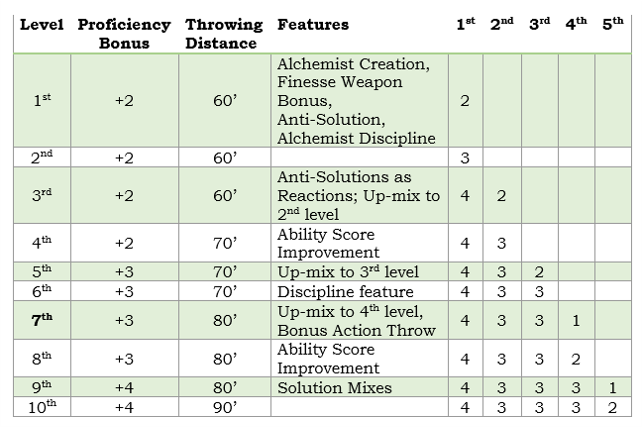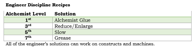 Transportation of Solutions – Due to the volatile and/or delicate nature of the solutions, only a certain number of solutions can be on the alchemist at one time. The number of solutions is shown on the alchemist’s table of how many recipes they have mastered along with how many solutions they can carry of each level. An up-mixed solution counts as the level that the solutions is up-mixed to. For example, if Entangle is up-mixed to cover a 40’ square then it is counted as a 2nd level solution.
