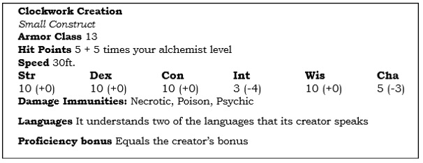 You can create a construct that obeys your commands. When doing repairs, your clockwork creation can give the engineer advantage on their die rolls. In combat, it shares your initiative count, but it takes its turn immediately after yours. It only takes the Dodge action on its turn unless you use your bonus action to give it a command. It has the following stat block: